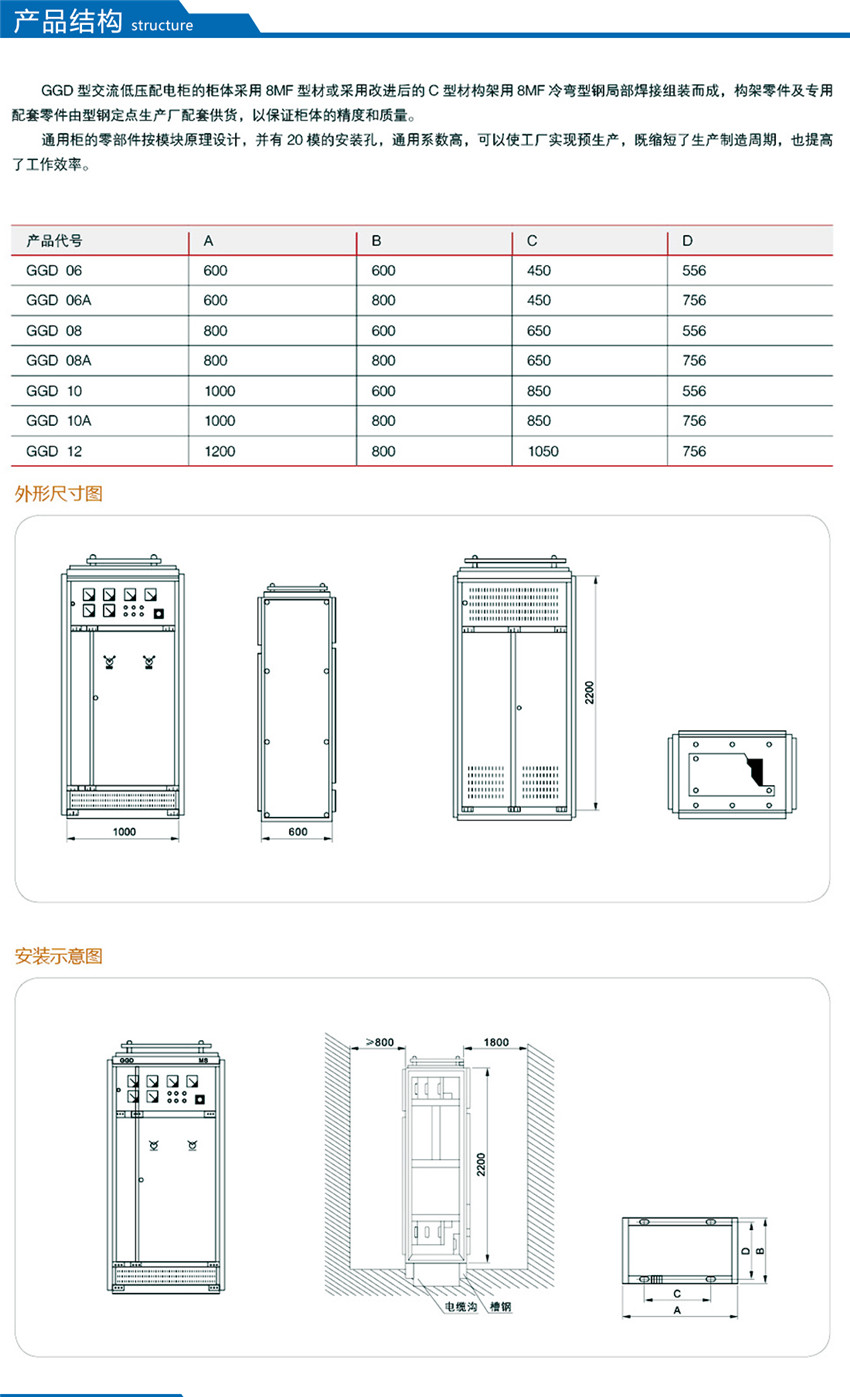 GGD型交流低壓配電柜是根據(jù)能源部主管上級,廣大電力用戶及設(shè)計部門的要求,本著安全、經(jīng)濟、合理、可靠的原則設(shè)計的新型配電柜。產(chǎn)品具有分斷能力高,動熱穩(wěn)定性好,電氣方案靈活、組合方便,系列性、實用性強,結(jié)構(gòu)新穎、防護等級高等特點,可以作低壓成套開關(guān)設(shè)備的更新?lián)Q代產(chǎn)品使用。并且廣泛適用于發(fā)電廠、變電所、工業(yè)企業(yè)等電力用戶作為交流50HZ,額定工作電壓380V,額定電流至3150A 的配電系統(tǒng)中作為動力,照明及配電設(shè)備的電能轉(zhuǎn)換、分配與控制之用。該產(chǎn)品分斷能力高,額定短結(jié)構(gòu)新穎等特點。該產(chǎn)品是我組裝式、固定面板開關(guān)柜的代表產(chǎn)品之一。