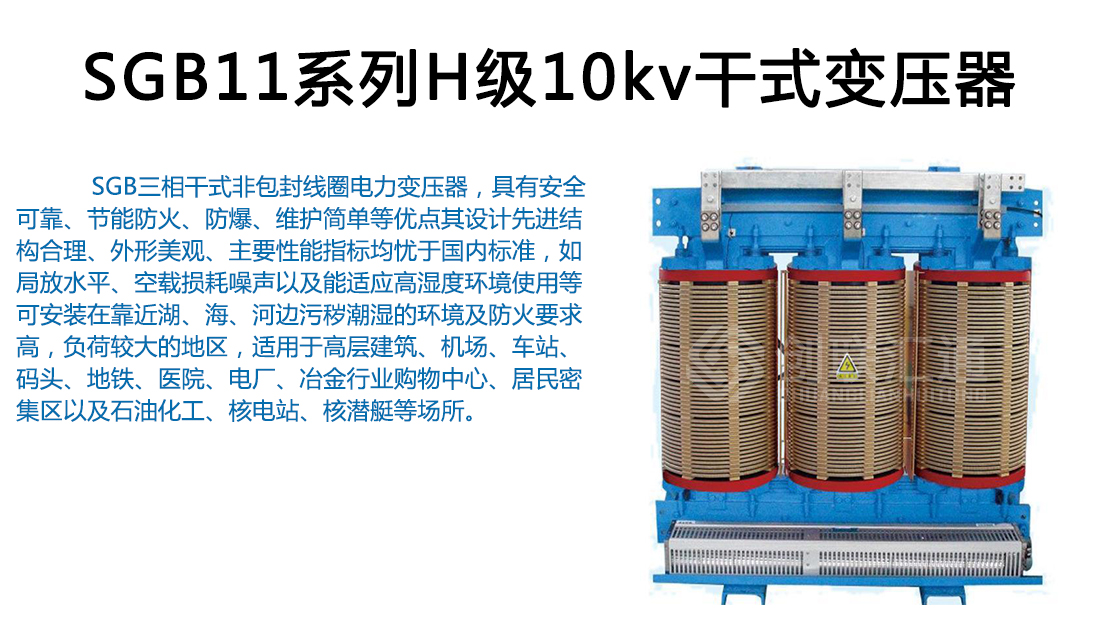 SG(B)11系列H級(jí)絕緣干式變壓器采用優(yōu)質(zhì)環(huán)保材料,先進(jìn)的生產(chǎn)檢測(cè)設(shè)備按嚴(yán)格的工藝生產(chǎn)而成,具有高性能、高安全、承受熱沖擊能力強(qiáng)等特點(diǎn),它適用于防火要求高、負(fù)荷波動(dòng)大以及污穢潮濕的惡劣環(huán)境中。如:高層建筑、商業(yè)中心、住宅小區(qū)、醫(yī)院、化工廠、核電站、船舶及其它安全性要求防火、防爆、防潮的配電網(wǎng)絡(luò)與工礦企業(yè)供配電系統(tǒng)等重要或特殊環(huán)境場(chǎng)所。