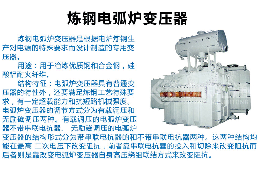 電弧爐變壓器具有普通變壓器的特性外,還要滿足煉鋼工藝特殊要求,有一定超載能力和抗短路機械強度。電弧爐變壓器的調(diào)節(jié)方式分為有載調(diào)壓和無勵磁調(diào)壓兩種。有載調(diào)壓的電弧爐變壓器不帶串聯(lián)電抗器。 無勵磁調(diào)壓的電弧爐變壓器的結構形式分為帶串聯(lián)電抗器的和不帶串聯(lián)電抗器兩種。這兩種結構均能在高 二次電壓下改變阻抗,前者靠串聯(lián)電抗器的投入和切除來改變阻抗,而后者則是靠改變電弧爐變壓器自身高 壓繞組聯(lián)結方式來改變阻抗。